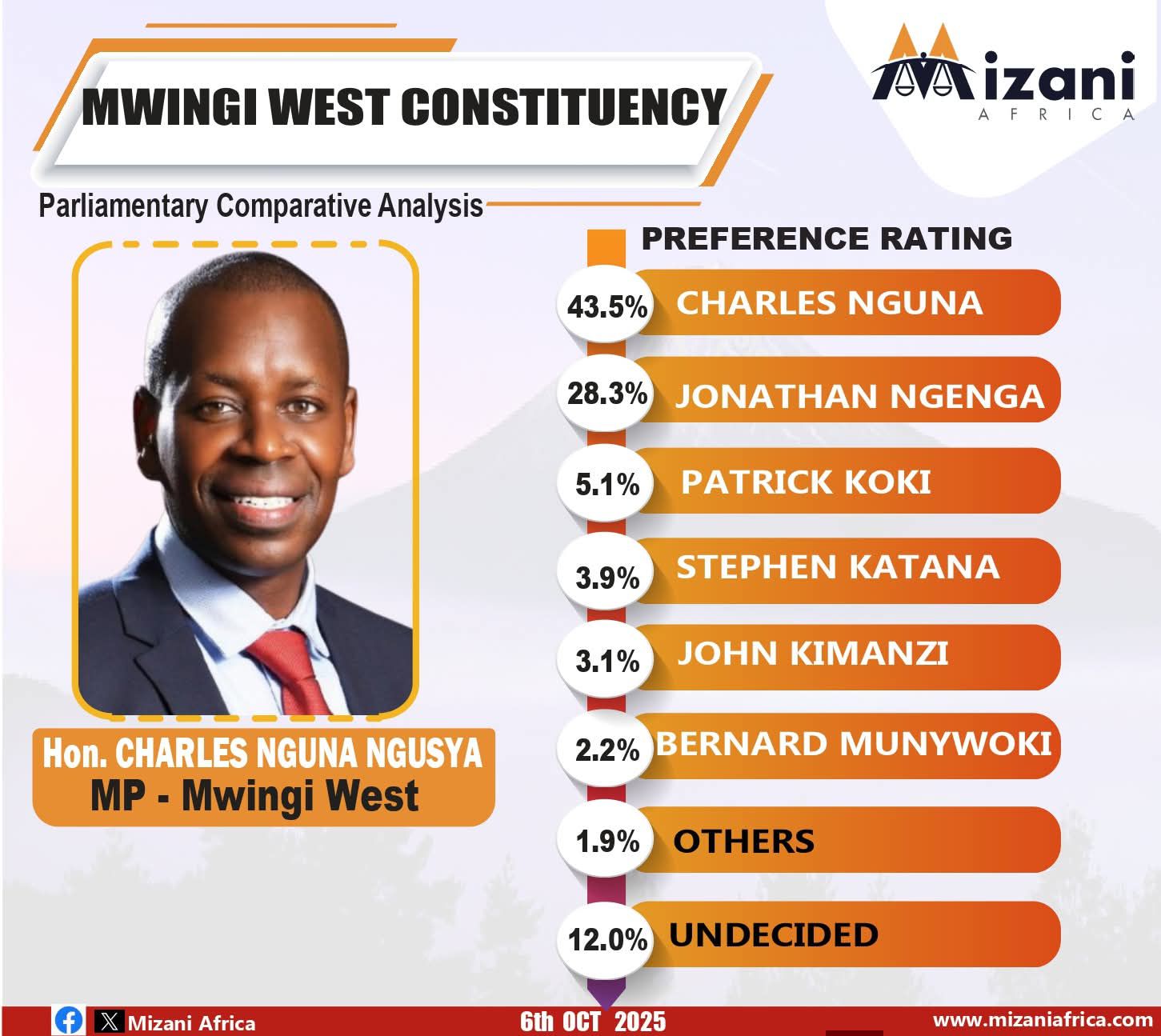 As the 2027 elections approach, the Mizani Africa findings highlight a constituency that appreciates Nguna’s achievements but remains alert to evolving political choices. The balance between satisfaction and scrutiny suggests that Mwingi West will remain one of Kitui County’s most closely watched battlegrounds in the next electoral cycle.