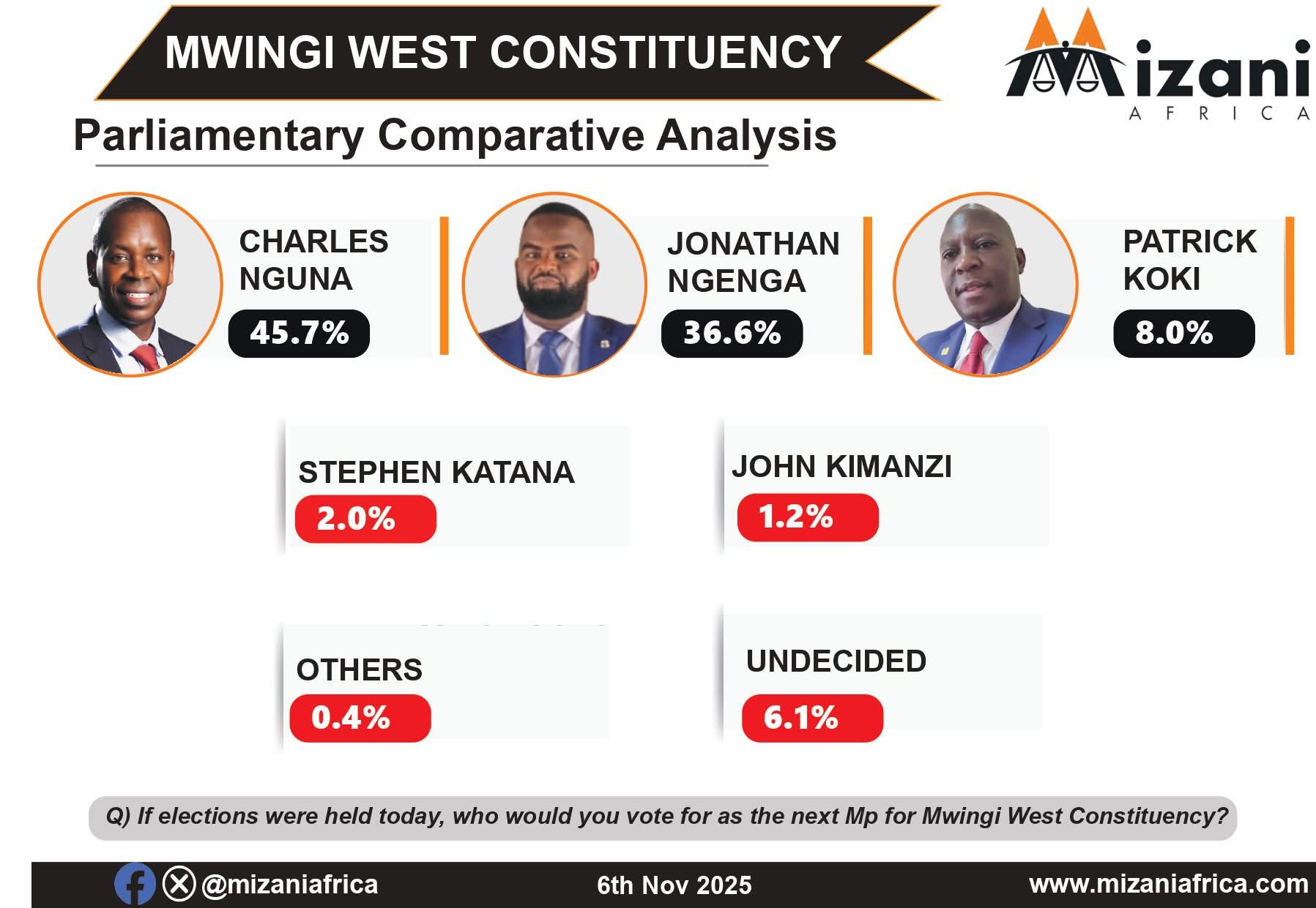 The political landscape in Mwingi West Constituency remains fiercely competitive as the latest data shows Hon. Charles Nguna maintaining a narrow lead against his rising challenger, Jonathan Ngenga. According to recent opinion trends, Nguna commands 45.7% of voter support, while Ngenga follows closely with 36.6%, signaling a potential shake-up ahead of the 2027 elections.