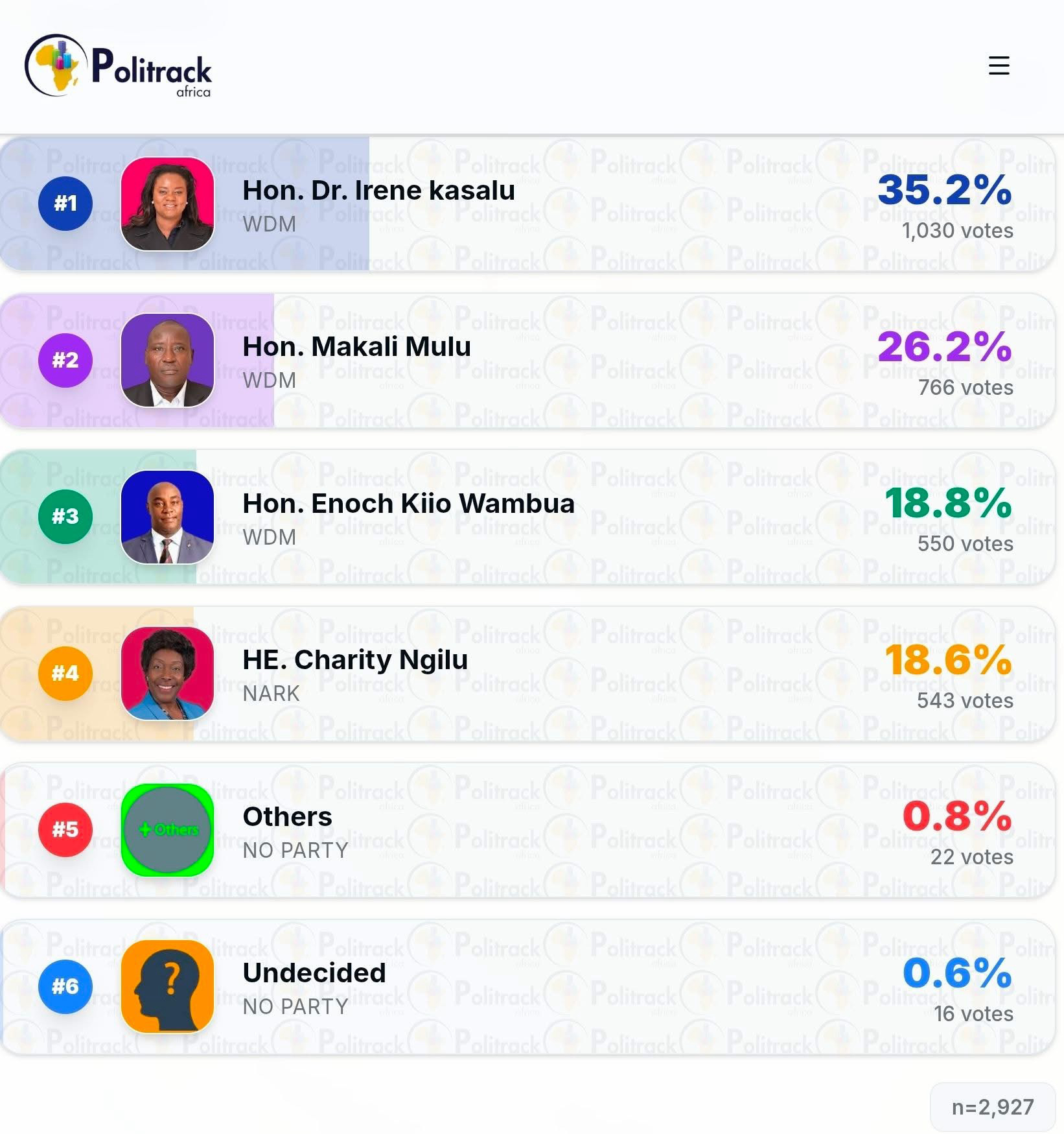 Political observers say the findings set the stage for what could become an intense nomination battle within WDM as the county heads toward the 2027 General Election, while Ngilu’s presence ensures the race remains competitive.