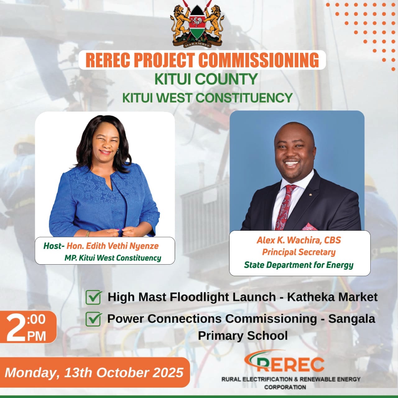 Kitui West Constituency on Monday, 13th October 2025, witnessed a major milestone in rural electrification as the National Government Constituency Development Fund (NG-CDF) in partnership with the Rural Electrification and Renewable Energy Corporation (REREC) commissioned key energy projects. The event, hosted by Kitui West Member of Parliament Hon. Edith Vethi Nyenze, marked a new dawn for residents who have long yearned for reliable power access.